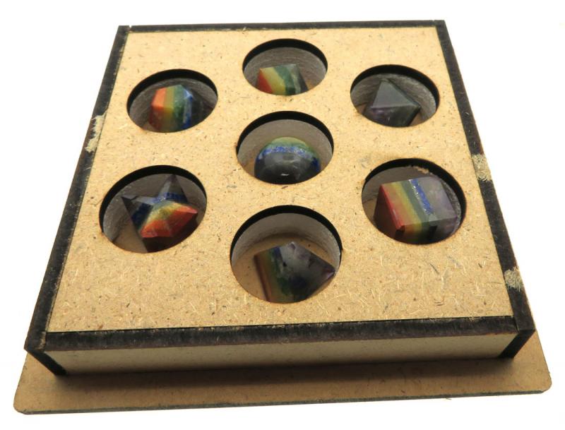 A Geometric set carved from genuine Gemstones (approx stone sizes 12mm to 15mm), presented in a reconstituted wood box (size 115x115x23mm).