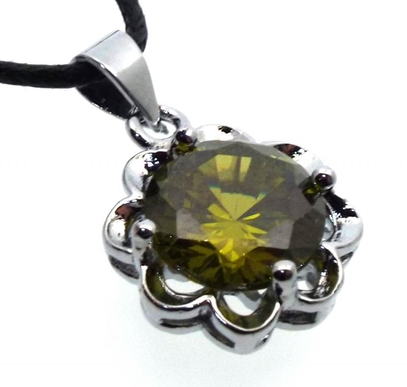 A good quality metal flower pendant with a coloured Zircon Crystal, that measures Approx 14x20mm. Supplied with a long waxed cotton cord.