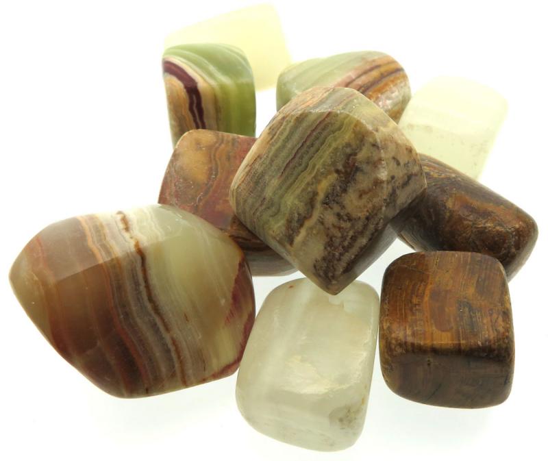 Onyx comes in many shades of: Cream, Brown and Green usually with striped patterning. These banded stripes are a type of silicate mineral Chalcedony and are closely related to Agate.