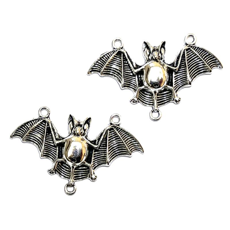 A pack of two silver coloured base metal bat charms each measuring approx 47x27x4mm (they have a 3 rings for fastening).