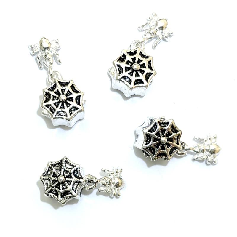 A pack of four silver coloured base metal dangling spider and web charms each measuring approx 20x8x7mm (they have a hole through the web).