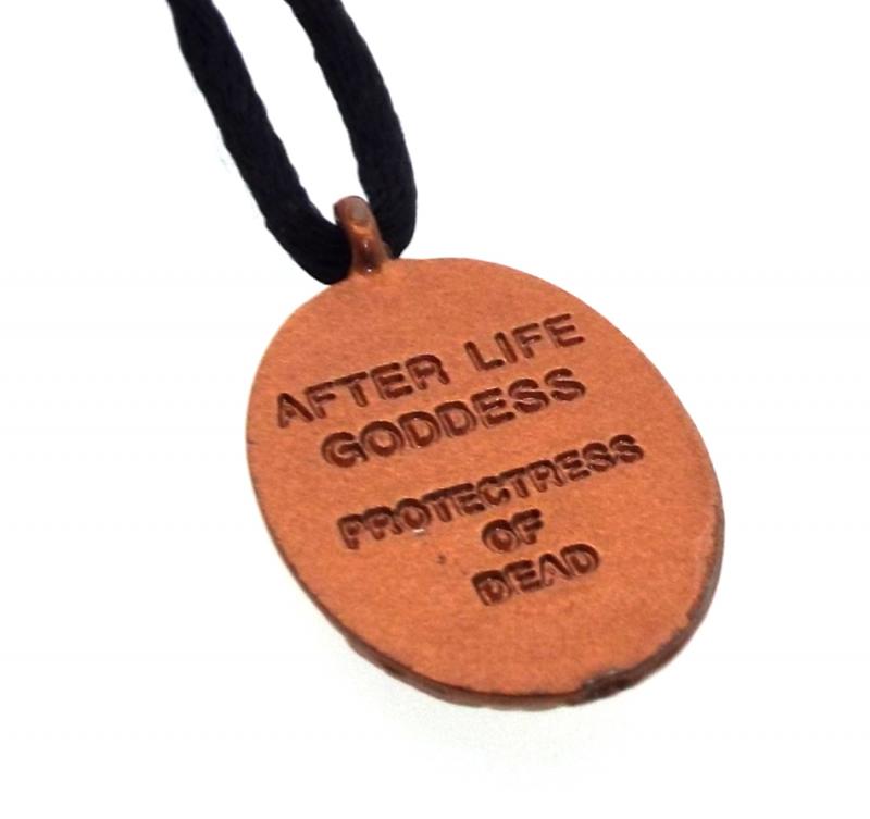 The reverse of the pendant has the words 'after life goddess protectress of dead' inscribed.