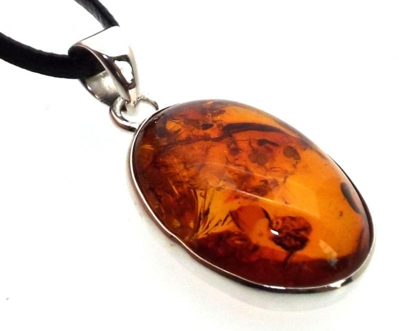 The Sterling Silver and Amber cabochon pendant measures 14mm wide x 21mm long and is supplied with a long cord.
