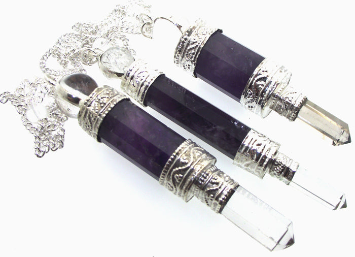 One end of the pendulum there is a little Quartz sphere, with a Amethyst cylinder in the centre and at the other end a Quartz point.