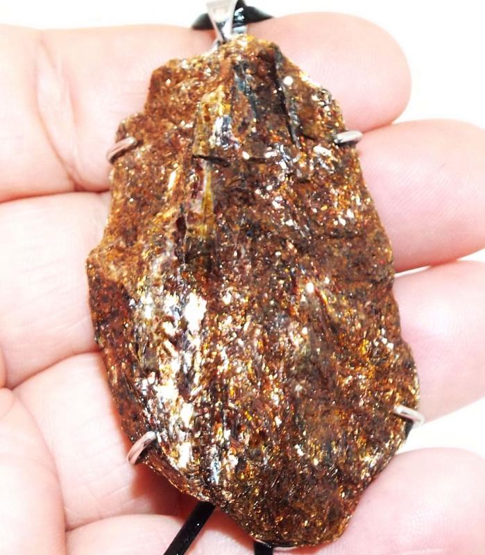 An impressive Astrophyllite Crystal set in Sterling Silver. Measures approx 33 mm wide x 56 mm long, supplied with a long black cord.