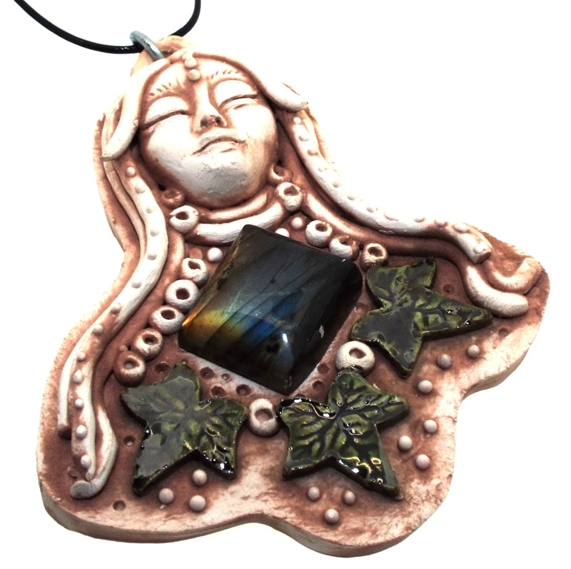 A locally hand crafted ceramic goddess with a Labradorite cabochon. Measures approx 70mm wide by 88mm tall.