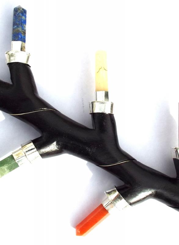 A tactile rosewood stem wand with a Quartz ball at its base and Gemstone points in the Chakra colours: Amethyst, Iolite, Green Aventurine, Carnelian, Red Jasper, Yellow Aventurine and Lapis Lazuli. A good tool with lots of uses. Approx length 10.5inch 26cm this will vary slightly.