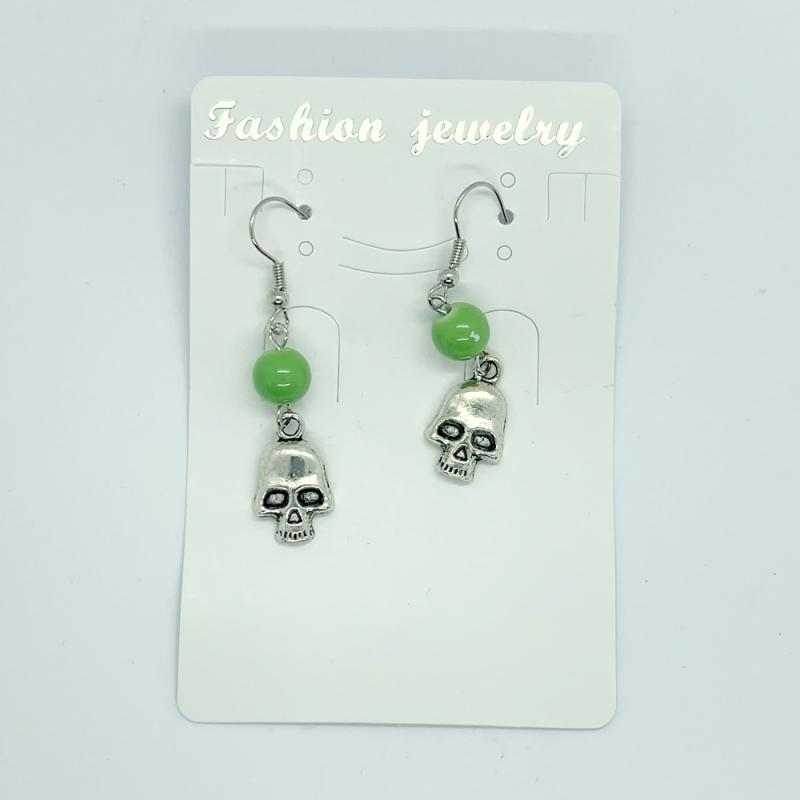 An affordable pair of metal skull design, 8mm beaded dropper earrings, with fishhook fittings. Measures approx 35x12mm.