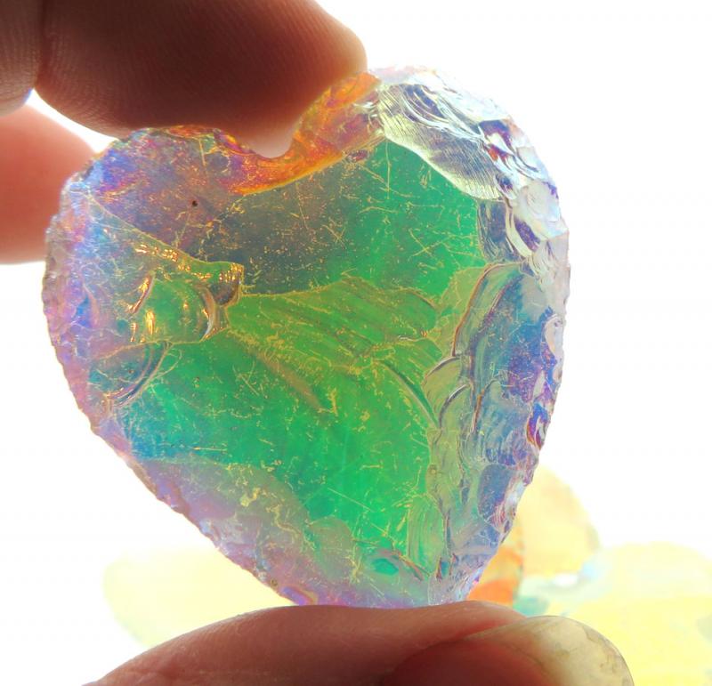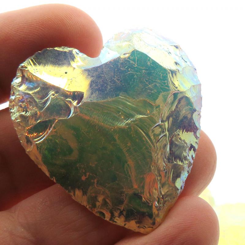 A single hand carved Aura Quartz Heart. Approx size 35 mm wide 40 mm tall 10 mm deep.
