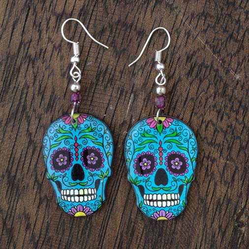 These fascinating and colourful big earrings are associated with the Latin American 'Day of The Dead.' The calaveras (Spanish for 'skull') are similar in style to the artwork and iconography of this fascinating holiday.