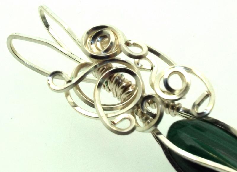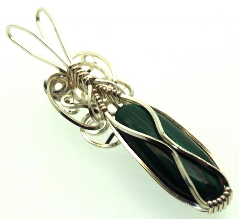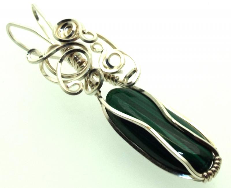 A polished Malachite Gemstone, wire wrapped with sterling silver copper core wire.