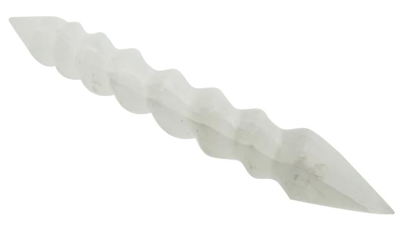 Natural Selenite carved into a spiral wand with a point at each end. Approx size 150mm long 22mm wide. Perfect for all types of crystal therapy and massage.