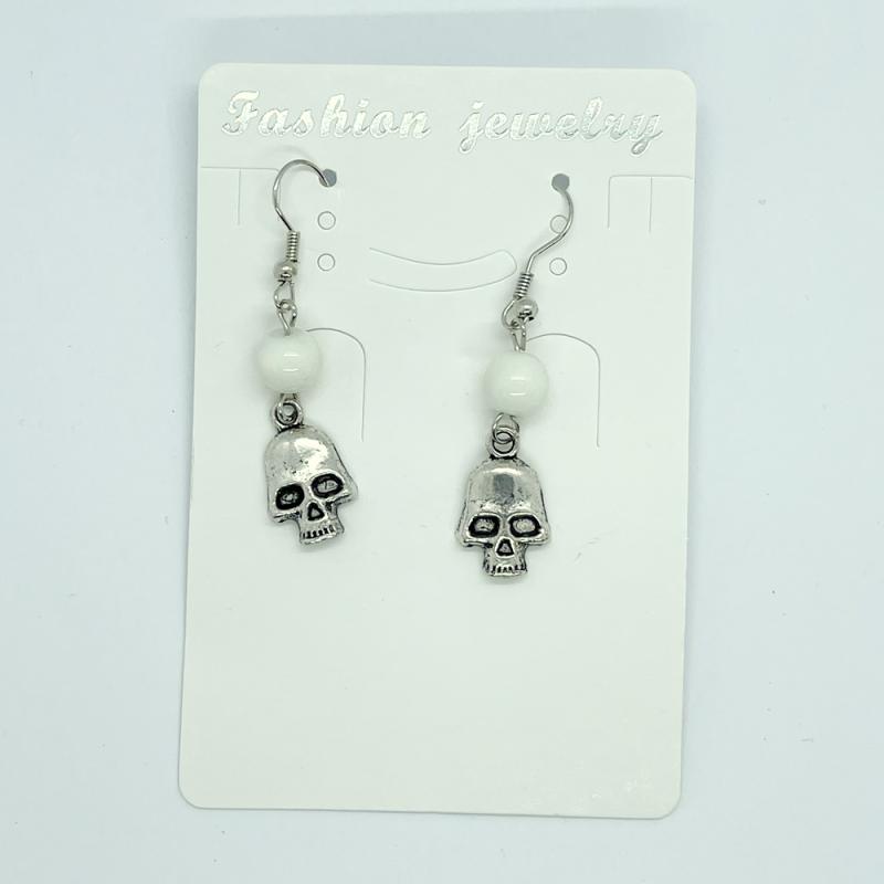 An affordable pair of metal skull design, 8mm beaded dropper earrings, with fishhook fittings. Measures approx 35x12mm.
